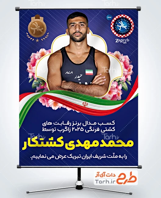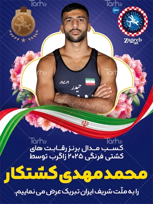 طرح بنر تبریک مدال برنز محمد مهدی کشتکار در مسابقات قهرمانی جهان با فرمت psd و قابل ویرایش در نرم افزار فتوشاپ به صورت لایه باز توسط تیم طراحان طرح دات آی آر طراحی شده است. در طرح لایه باز تبریک قهرمانی ورزشی از تصاویر و المان های با کیفیت و متناسب با استاندارد چاپ استفاده گردیده است. طرح بنر تبریک مدال برنز محمد مهدی کشتکار شامل عکس پهلوان محمد مهدی کشتکار و وکتور گل و پرچم ایران می باشد که المان های استفاده شده در بنر لایه باز تبریک قهرمانی محمد مهدی کشتکار قابلیت ویرایش، جابه جایی و تغییر سایز را دارا بوده و شما می توانید متناسب با سلیقه خودتان طرح بنر تبریک قهرمانی را ویرایش نمایید.