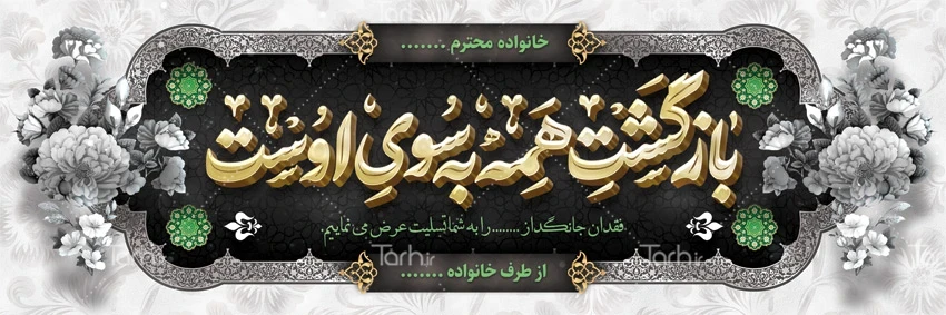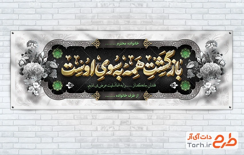 بنر خام عرض تسلیت با فرمت psd و قابل ویرایش در نرم افزار فتوشاپ به صورت لایه باز توسط تیم طراحان طرح دات آی آر طراحی شده است. در طرح لایه باز تسلیت از تصاویر و المان های با کیفیت و متناسب با استاندارد چاپ استفاده گردیده است. طرح بنر تسلیت خام شامل خوشنویسی خوشنویسی بازگشت همه به سوی اوست، وکتور گل و کادر اسلیمی می باشد که المان های استفاده شده در بنر لایه باز تسلیت قابلیت ویرایش، جابه جایی و تغییر سایز را دارا بوده و شما می توانید متناسب با سلیقه خودتان طرح عرض تسلیت را ویرایش نمایید.