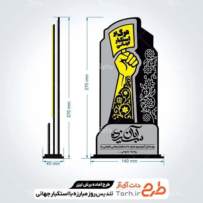 طرح لیزر تندیس روز مبارزه با استکبار جهانی با نرم افزار Corel Draw به صورت لایه باز و قابل ویرایش توسط تیم طراحان طرح دات آی آر طراحی شده است. در طرح آماده برش لیزری استند روز دانش آموز و 13 آبان نکات مهم طراحی لیزر مانند رعایت ضخامت چوب، ابعاد استاندارد طرح و چیدمان درست برای کمترین پرتی رعایت گردیده است. طرح برش لیزری تندیس روز مبارزه با استکبار جهانی، آماده اجرا توسط دستگاه های برش، سی ان سی (CNC)، حکاکی لیزر و حکاکی روی چوب میباشد. شما میتوانید از طرح لیزر روز دانش آموز جهت تولید انواع تندیس و استند روز دانش آموز به عنوان هدیه 13 آبان استفاده کنید.