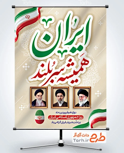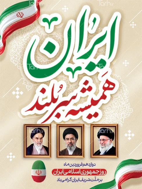 طرح پوستر آماده روز جمهوری اسلامی با فرمت psd و قابل ویرایش در نرم افزار فتوشاپ به صورت لایه باز توسط تیم طراحان طرح دات آی آر طراحی شده است. در طرح لایه باز روز جمهوری اسلامی از تصاویر و المان های با کیفیت و متناسب با استاندارد چاپ استفاده گردیده است. پوستر 12 فروردین شامل وکتور پرچم ایران و خوشنویسی ایران همیشه سربلند، قاب عکس شهید سید علی خامنه ای، سید مجتبی خامنه ای و امام خمینی میباشد که المان های استفاده شده در بنر بزرگداشت 12 فروردین قابلیت ویرایش، جابه جایی و تغییر سایز را دارا بوده و شما می توانید متناسب با سلیقه خودتان طرح 12 فروردین را ویرایش نمایید.