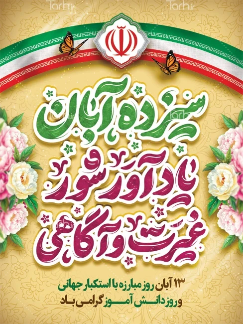 طرح لایه باز پوستر سیزده آبان با فرمت psd و قابل ویرایش در نرم افزار فتوشاپ به صورت لایه باز توسط تیم طراحان طرح دات آی آر طراحی شده است. در طرح بنر 13 آبان از تصاویر و المان های با کیفیت و متناسب با استاندارد چاپ استفاده گردیده است. طرح بنر روز دانش آموز شامل خوشنویسی 13 آبان یادآور شور غیرت و آگاهی و وکتور پرچم ایران می باشد که المان های استفاده شده در طرح لایه باز بنر روز دانش آموز قابلیت ویرایش، جابه جایی و تغییر سایز را دارا بوده و شما می توانید متناسب با سلیقه خودتان طرح 13 آبان را ویرایش نمایید.