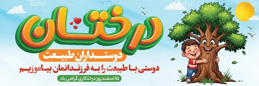 طرح آماده پلاکارد روز درختکاری با تصویرسازی درخت و پسر کد فایل 0234758