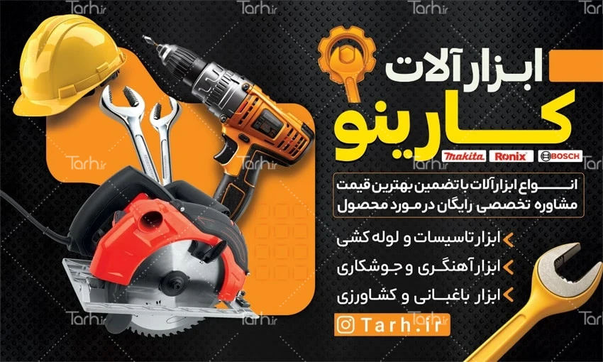 طرح بنر فروش ابزارآلات صنعتی با فرمت psd و قابل ویرایش در نرمافزار فتوشاپ بهصورت لایه باز توسط تیم طراحان طرح دات آی آر طراحی شده است. در طرح لایه باز بنر ابزار فروشی از تصاویر و المانهای باکیفیت و متناسب با استاندارد چاپ استفادهشده، همچنین نکات مهم در طرح بنر مشاغل مانند رنگبندی، رعایت حاشیه، فاصلهها، سایز و نوع فونت مناسب طراحی بنر جلو مغازه و ... رعایت گردیده است. طرح بنر ابزار آلات شامل عکس دریل و متن تبلیغاتی ابزار فروشی میباشد که المانهای استفادهشده در طرح پوستر ابزار فروشی قابلیت ویرایش، جابهجایی و تغییر سایز را دارا بوده و شما میتوانید متناسب باسلیقه خودتان طرح بنر تبلیغاتی ابزار آلات را ویرایش نمایید، همچنین با تغییر تصاویر و متنها میتوانید طرح پوستر فروشگاه ابزارآلات را به طرح تابلوی شغل موردنظر خود تبدیل نمایید.