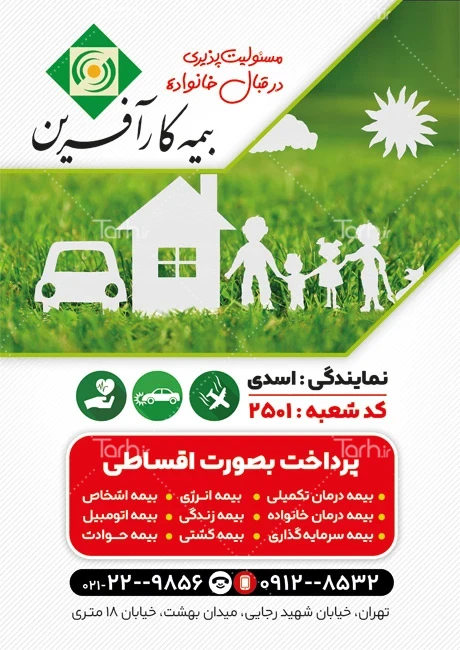 طرح پوستر تبلیغاتی بیمه کارآفرین با فرمت psd و قابل ویرایش در نرمافزار فتوشاپ بهصورت لایه باز توسط تیم طراحان طرح دات آی آر طراحی شده است. در نمونه تراکت بیمه کارآفرین از تصاویر و المانهای باکیفیت و متناسب با استاندارد چاپ استفادهشده، همچنین نکات مهم در طرح تراکت بیمه کارآفرین مانند رنگبندی، رعایت حاشیه، فاصلهها، فضای کافی برای درج متن، سایز و نوع فونت مناسب طراحی تراکت و ... رعایت گردیده است. طرح لایه باز تراکت نمایندگی بیمه شامل لوگو بیمه کارآفرین، وکتور ماشین، وکتور خانه و وکتور خانه میباشد که المانهای استفادهشده در دانلود تراکت لایه باز بیمه کارآفرین قابلیت ویرایش، جابهجایی و تغییر سایز را دارا بوده و شما میتوانید متناسب باسلیقه خودتان تراکت لایه باز بیمه کارآفرین را ویرایش نمایید، همچنین با تغییر تصاویر و متنها میتوانید طرح تراکت نمایندگی بیمه کارآفرین را به طرح تراکت کسب و کار مد نظر خود شخصی سازی نمایید.