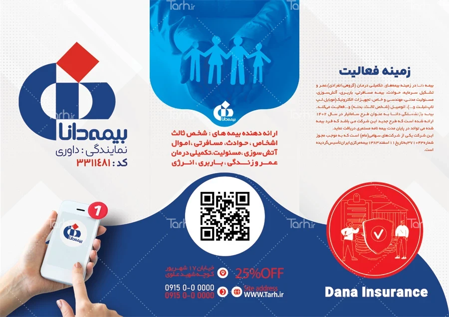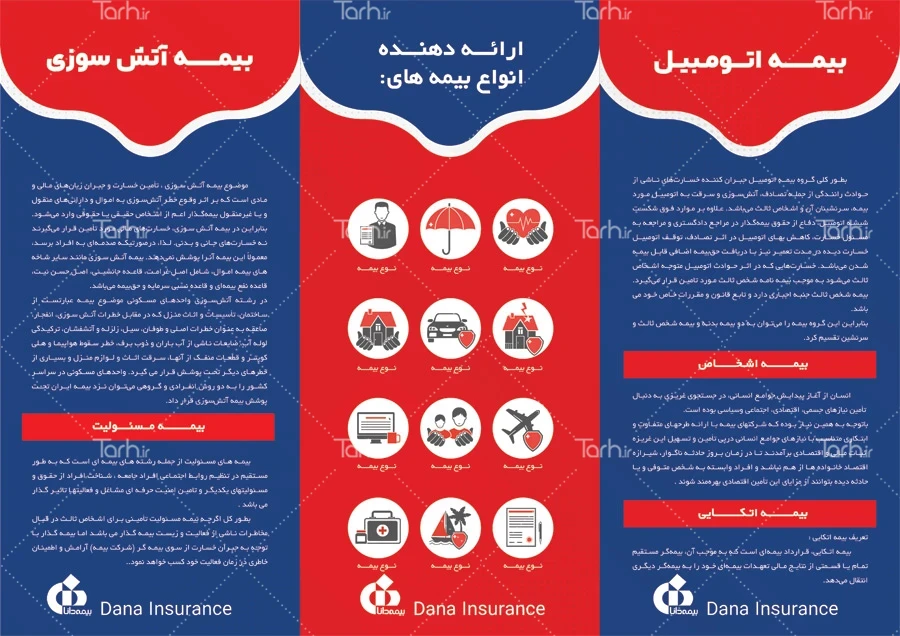 دانلود طرح بروشور کارگزاری بیمه دانا با فرمت psd و قابل ویرایش در نرم افزار فتوشاپ به صورت لایه باز توسط تیم طراحان طرح دات آی آر طراحی شده است. در طرح لایه باز بروشور دفتر بیمه که غالباً در قالب سه و چهار لت (چند لتی) طراحی میشود از تصاویر و المان های با کیفیت و متناسب با استاندارد چاپ استفاده گردیده است. طرح بروشور نمایندگی بیمه شامل وکتور آرم شرکت بیمه دانا می باشد که المان های استفاده شده در بروشور لایه باز بیمه دانا قابلیت حذف، ویرایش، جابه جایی و تغییر سایز را دارا بوده و شما می توانید متناسب با سلیقه خودتان طرح بروشور راهنمای شرکت بیمه را ویرایش نمایید.