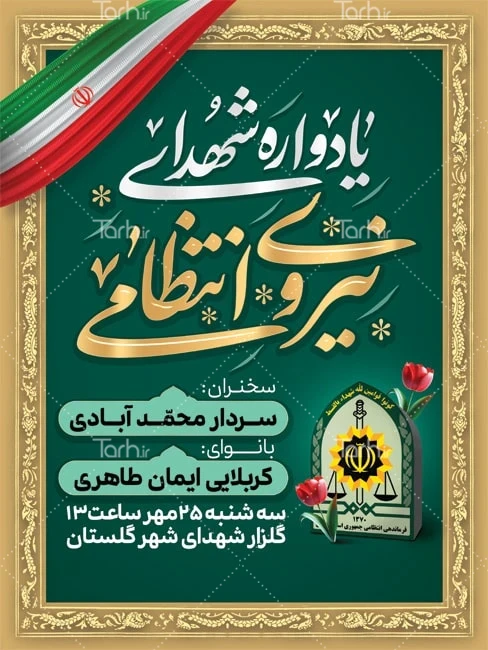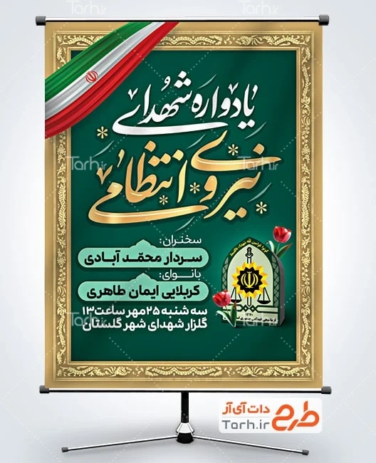 دانلود بنر اطلاع رسانی یادواره شهدای نیروی انتظامی با فرمت psd و قابل ویرایش در نرم افزار فتوشاپ به صورت لایه باز توسط تیم طراحان طرح دات آی آر طراحی شده است. در طرح لایه باز اطلاعیه یادواره شهدا نیروی انتظامی از تصاویر و المان های با کیفیت و متناسب با استاندارد چاپ استفاده گردیده است. طرح بنر یادواره شهدای نیرو انتظامی شامل خوشنویسی یادواره شهدای نیروی انتظامی، عکس لوگو فرماندهی انتظامی و پرچم ایران می باشد که المان های استفاده شده در بنر اطلاع رسانی یادواره شهدا نیرو انتظامی قابلیت ویرایش، جابه جایی و تغییر سایز را دارا بوده و شما می توانید متناسب با سلیقه خودتان طرح یادواره شهدا نیروی انتظامی را ویرایش نمایید.