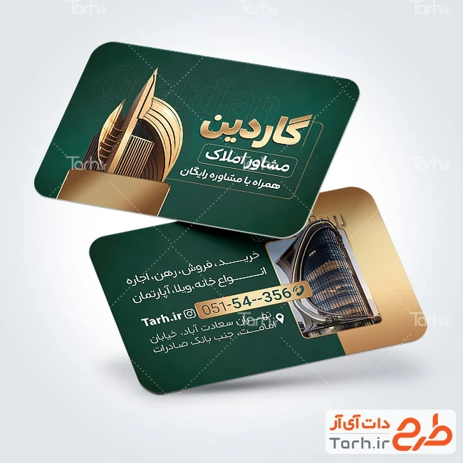 دانلود طرح کارت ویزیت مشاور املاک دارای رنگبندی سبز و طلایی کد فایل 0392751