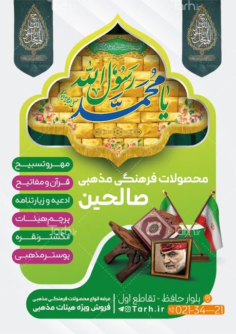 طرح psd تراکت محصولات فرهنگی و مذهبی با فرمت psd و قابل ویرایش در نرمافزار فتوشاپ بهصورت لایه باز توسط تیم طراحان طرح دات آی آر طراحی شده است. در نمونه تراکت محصولات فرهنگی و مذهبی از تصاویر و المانهای باکیفیت و متناسب با استاندارد چاپ استفادهشده، همچنین نکات مهم در طرح تراکت محصولات فرهنگی و مذهبی مانند رنگبندی، رعایت حاشیه، فاصلهها، فضای کافی برای درج متن، سایز و نوع فونت مناسب طراحی تراکت و ... رعایت گردیده است. طرح لایه باز تراکت محصولات فرهنگی و مذهبی شامل عکس قرآن، مهر و تسبیح و قاب عکس سردار سلیمانی میباشد که المانهای استفادهشده در طرح تراکت فروش محصولات فرهنگی قابلیت ویرایش، جابهجایی و تغییر سایز را دارا بوده و شما میتوانید متناسب باسلیقه خودتان تراکت لایه باز محصولات فرهنگی و مذهبی را ویرایش نمایید، همچنین با تغییر تصاویر و متنها میتوانید طرح تراکت محصولات مذهبی را به طرح تراکت کسب و کار مد نظر خود شخصی سازی نمایید.