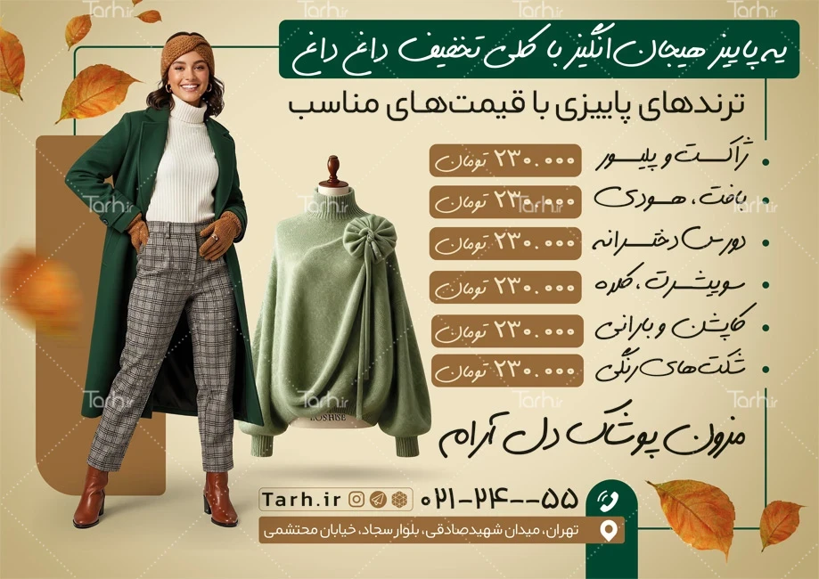 طرح تراکت تبلیغاتی فروشگاه پوشاک زنانه با تم پاییزی کد فایل 0412369