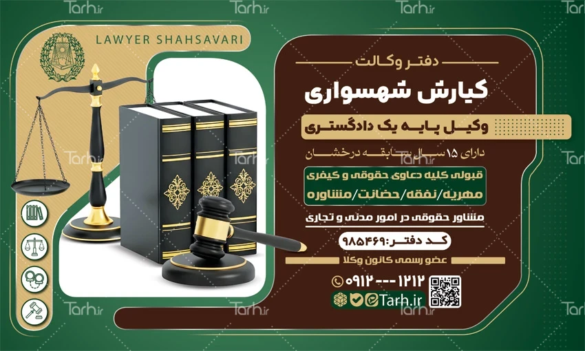 نمونه بنر دفتر وکالت با فرمت psd و قابل ویرایش در نرمافزار فتوشاپ بهصورت لایه باز توسط تیم طراحان طرح دات آی آر طراحی شده است. در طرح لایه باز بنر وکیل از تصاویر و المانهای باکیفیت و متناسب با استاندارد چاپ استفادهشده، همچنین نکات مهم در طرح بنر مشاغل مانند رنگبندی، رعایت حاشیه، فاصلهها، سایز و نوع فونت مناسب طراحی پوستر مشاغل و ... رعایت گردیده است. بنر لایه باز وکیل شامل عکس ترازوی عدالت و چکش و کتاب قانون میباشد که المانهای استفادهشده در طرح پوستر دفتر وکالت قابلیت ویرایش، جابهجایی و تغییر سایز را دارا بوده و شما میتوانید متناسب باسلیقه خودتان طرح بنر تبلیغاتی دفتر وکالت را ویرایش نمایید، همچنین با تغییر تصاویر و متنها میتوانید طرح پوستر وکیل را به طرح پوستر شغل موردنظر خود تبدیل نمایید.