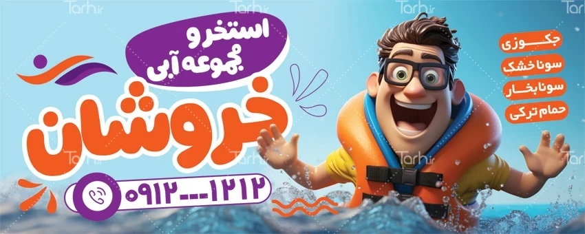 دانلود تابلو استخر و مجموعه آبی با فرمت psd و قابل ویرایش در نرم افزار فتوشاپ به صورت لایه باز توسط تیم طراحان طرح دات آی آر طراحی شده است. در طرح لایه باز بنر استخر از تصاویر و المان های با کیفیت و متناسب با استاندارد چاپ استفاده شده، همچنین نکات مهم در طرح تابلو مغازه مانند رنگ بندی، رعایت حاشیه، فاصله ها، سایز و نوع فونت مناسب طراحی تابلو مشاغل و ... رعایت گردیده است. طرح بنر استخر سرپوشیده شامل تصویرسازی شناگر می باشد که المان های استفاده شده در طرح تابلو سونا و جکوزی قابلیت ویرایش، جابه جایی و تغییر سایز را دارا بوده و شما می توانید متناسب با سلیقه خودتان طرح بنر تبلیغاتی استخر و مجموعه آبی را ویرایش نمایید، همچنین با تغییر تصاویر و متن ها می توانید طرح تابلو مجموعه آبی را به طرح تابلوی شغل مورد نظر خود تبدیل نمایید.