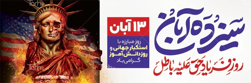 طرح لایه باز پلاکارد 13 آبان با فرمت psd و قابل ویرایش در نرم افزار فتوشاپ به صورت لایه باز توسط تیم طراحان طرح دات آی آر طراحی شده است. در طرح لایه باز بنر 13 آبان از تصاویر و المان های با کیفیت و متناسب با استاندارد چاپ استفاده گردیده است. طرح لایه باز بنر روز دانش آموز شامل خوشنویسی سیزده آبان روز فریاد حق علیه باطل، عکس پرچم آمریکا و مجسمه آزادی می باشد که المان های استفاده شده در طرح بنر روز دانش آموز قابلیت ویرایش، جابه جایی و تغییر سایز را دارا بوده و شما می توانید متناسب با سلیقه خودتان طرح دانش آموز را ویرایش نمایید.