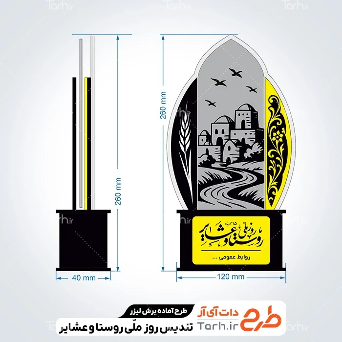 طرح تندیس روز ملی روستا و عشایر با نرم افزار Corel Draw به صورت لایه باز و قابل ویرایش توسط تیم طراحان طرح دات آی آر طراحی شده است. در طرح آماده برش لیزری استند روز روستا و عشایر نکات مهم طراحی لیزر مانند رعایت ضخامت چوب، ابعاد استاندارد طرح و چیدمان درست برای کمترین پرتی رعایت گردیده است. طرح برش لیزری تندیس روز روستا و عشایر، آماده اجرا توسط دستگاه های برش، سی ان سی (CNC)، حکاکی لیزر و حکاکی روی چوب میباشد. شما میتوانید از طرح لیزر روز ملی روستا و عشایر جهت تولید انواع تندیس و استند روز روستا و عشایر به عنوان هدیه در روز ملی روستا و عشایر استفاده کنید.