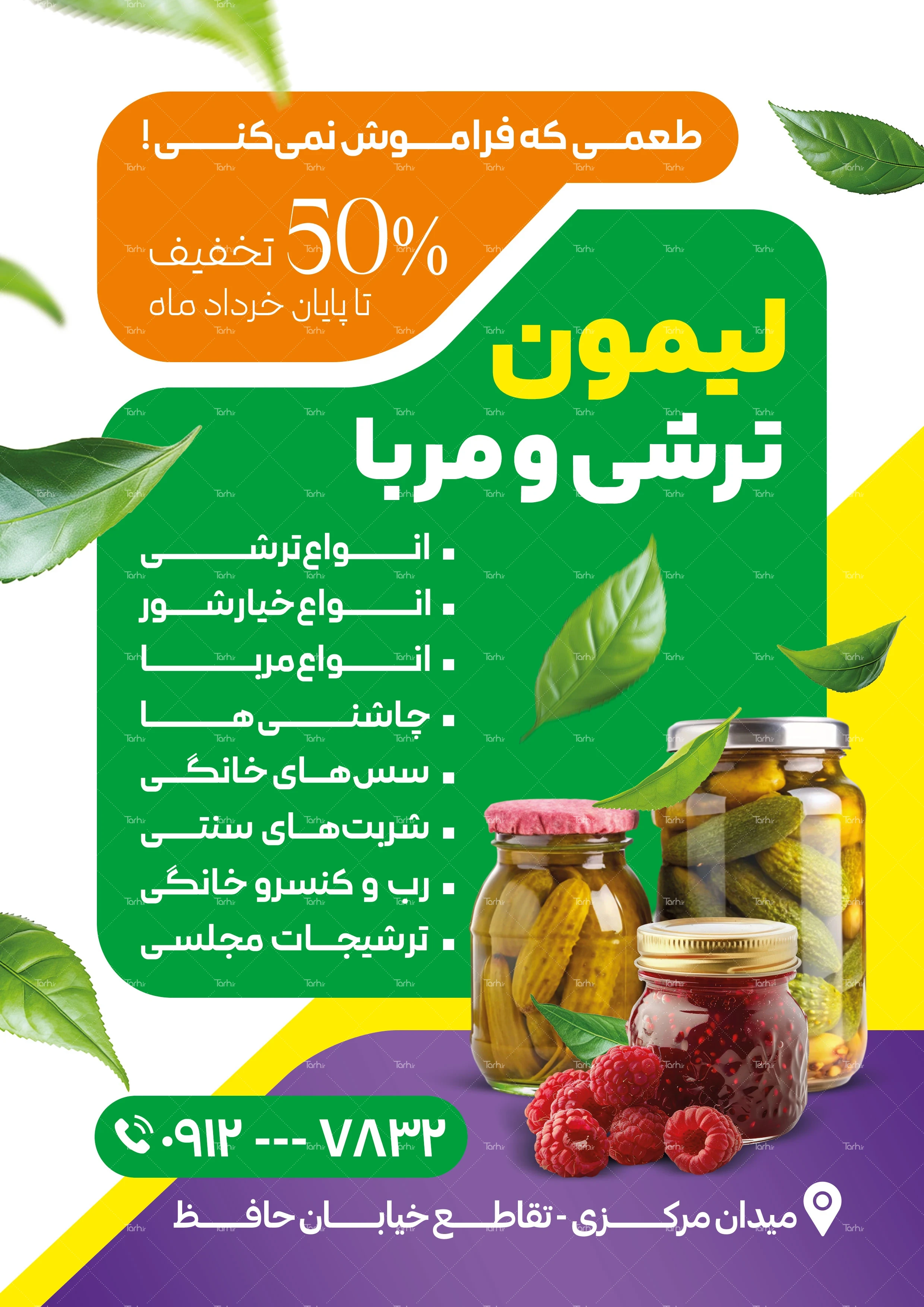 طرح آماده تراکت ترشیجات و مربا با فرمت psd و قابل ویرایش در نرمافزار فتوشاپ بهصورت لایه باز توسط تیم طراحان طرح دات آی آر طراحی شده است. در نمونه تراکت فروشگاه ترشی از تصاویر و المانهای باکیفیت و متناسب با استاندارد چاپ استفادهشده، همچنین نکات مهم در طرح تراکت ترشی و مربا مانند رنگبندی، رعایت حاشیه، فاصلهها، فضای کافی برای درج متن، سایز و نوع فونت مناسب طراحی تراکت و ... رعایت گردیده است. طرح لایه باز تراکت ترشیجات شامل عکس شیشه ترشی و مربا میباشد که المانهای استفادهشده در طرح تراکت ترشیجات قابلیت ویرایش، جابهجایی و تغییر سایز را دارا بوده و شما میتوانید متناسب باسلیقه خودتان تراکت لایه باز ترشی فروشی را ویرایش نمایید، همچنین با تغییر تصاویر و متنها میتوانید طرح تراکت مربا و ترشی را به طرح تراکت کسب و کار مد نظر خود شخصی سازی نمایید.
