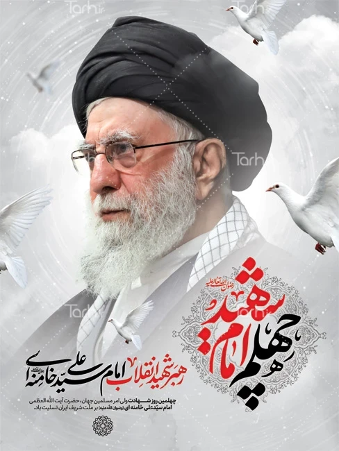 طرح پوستر چهلم شهادت آیت الله سید علی خامنه ای با خوشنویسی چهلم امام شهید کد فایل 0547692