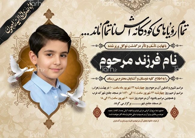 طرح خام آگهی ترحیم فرزند با فرمت psd و قابل ویرایش در نرمافزار فتوشاپ بهصورت لایه باز توسط تیم طراحان طرح دات آی آر طراحی شده است. در فایل لایه باز اعلامیه ترحیم کودک از تصاویر و المانهای باکیفیت و متناسب با استاندارد چاپ استفادهشده، همچنین نکات مهم در طرح آگهی ترحیم کودک مانند رنگبندی، رعایت حاشیه، فاصلهها، فضای کافی برای درج متن، سایز و نوع فونت مناسب طراحی آگهی ترحیم و ... رعایت گردیده است. طرح لایه باز آگهی ترحیم پسر جوان شامل عکس کبوتر و خوشنویسی تمام رویاهای کودکانه اش ناتمام ماند و انا لله و انا الیه راجعون با محل جایگذاری عکس متوفی میباشد که المانهای استفاده شده در آگهی ترحیم لایه باز بچه قابلیت ویرایش، جابهجایی و تغییر سایز را دارا بوده و شما میتوانید متناسب باسلیقه خودتان نمونه اعلامیه ترحیم کودک را ویرایش نمایید.