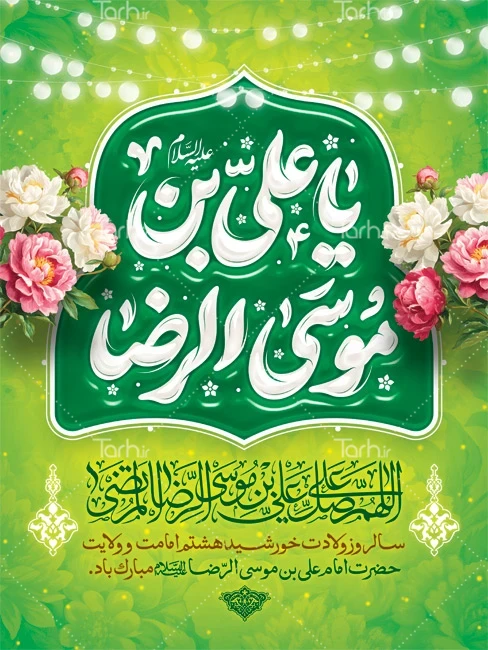 طرح لایه باز پوستر میلاد امام رضا با خوشنویسی یا علی بن موسی الرضا کد فایل 0625483