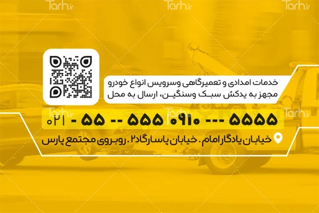 طرح psd کارت ویزیت خدمات امدادخودرو با فرمت psd و قابل ویرایش در نرمافزار فتوشاپ بهصورت لایه باز و پشت و رو (دو رو) توسط تیم طراحان طرح دات آی آر طراحی شده است. طرح کارت ویزیت امداد خودرو از تصاویر و المانهای باکیفیت و متناسب با استاندارد چاپ استفادهشده، همچنین نکات مهم در طرح کارت ویزیت مانند رنگبندی، رعایت حاشیه، فاصلهها، فضای کافی برای درج متن، سایز و نوع فونت مناسب طراحی کارت ویزیت و ... رعایت گردیده است. نمونه کارت ویزیت امداد خودرو شامل رنگ بندی زرد و وکتور ماشین امداد خودرو میباشد که المانهای استفادهشده در طرح کارت ویزیت یدک کش قابلیت ویرایش، جابهجایی و تغییر سایز را دارا بوده و شما میتوانید متناسب باسلیقه خودتان کارت ویزیت لایه باز امداد خودرو را ویرایش نمایید، همچنین با تغییر تصاویر و متنها میتوانید طرح کارت ویزیت خدمات حمل خودرو را به طرح کارت ویزیت کسب و کار مد نظر خود شخصی سازی نمایید.