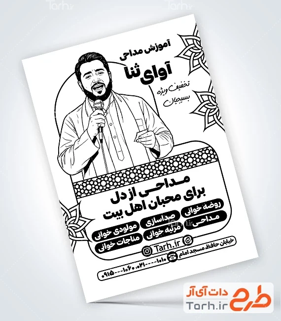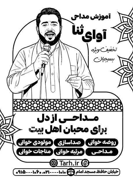 نمونه تراکت ریسو آموزشگاه مداحی با وکتور سیاه سفید مداح کد فایل 0712549