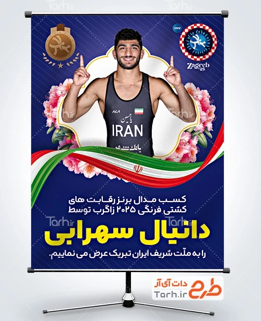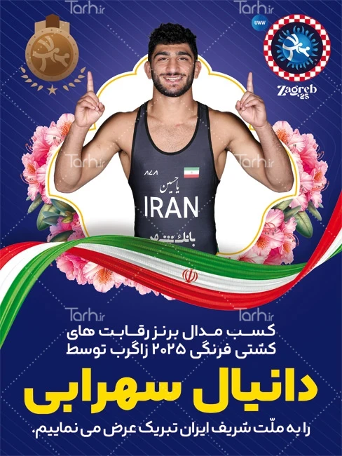 طرح بنر تبریک مدال برنز دانیال سهرابی در مسابقات قهرمانی جهان با فرمت psd و قابل ویرایش در نرم افزار فتوشاپ به صورت لایه باز توسط تیم طراحان طرح دات آی آر طراحی شده است. در طرح لایه باز تبریک قهرمانی ورزشی از تصاویر و المان های با کیفیت و متناسب با استاندارد چاپ استفاده گردیده است. طرح بنر تبریک مدال برنز دانیال سهرابی شامل عکس پهلوان دانیال سهرابی و وکتور گل و پرچم ایران می باشد که المان های استفاده شده در بنر لایه باز تبریک قهرمانی دانیال سهرابی قابلیت ویرایش، جابه جایی و تغییر سایز را دارا بوده و شما می توانید متناسب با سلیقه خودتان طرح بنر تبریک قهرمانی را ویرایش نمایید.