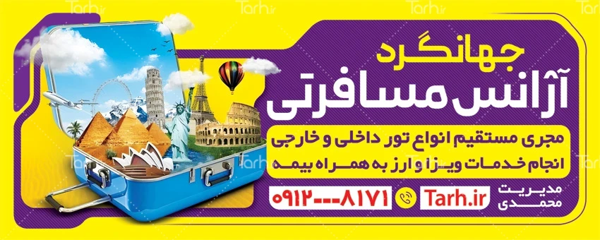 طرح بنر تبلیغاتی آژانس مسافرتی با فرمت psd و قابل ویرایش در نرمافزار فتوشاپ بهصورت لایه باز توسط تیم طراحان طرح دات آی آر طراحی شده است. در بنر خام آژانس هواپیمایی از تصاویر و المانهای باکیفیت و متناسب با استاندارد چاپ استفادهشده، همچنین نکات مهم در طرح بنر مشاغل مانند رنگبندی، رعایت حاشیه، فاصلهها، سایز و نوع فونت مناسب طراحی تابلو مشاغل و ... رعایت گردیده است. طرح بنر آژانس مسافرتی شامل عکس اماکن گردشگری در چمدان میباشد که المانهای استفادهشده در طرح تابلو آژانس هواپیمایی قابلیت ویرایش، جابهجایی و تغییر سایز را دارا بوده و شما میتوانید متناسب باسلیقه خودتان طرح تابلو تبلیغاتی آژانس مسافرتی را ویرایش نمایید، همچنین با تغییر تصاویر و متنها میتوانید طرح تابلو دفتر هواپیمایی را به طرح تابلوی شغل موردنظر خود تبدیل نمایید.