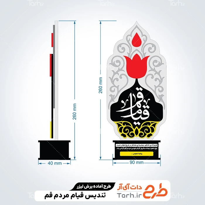 فایل لایه باز لیزر تندیس قیام قم با نرم افزار Corel Draw به صورت لایه باز و قابل ویرایش توسط تیم طراحان طرح دات آی آر طراحی شده است. در طرح آماده برش لیزری استند بزرگداشت شهدای قیام قم نکات مهم طراحی لیزر مانند رعایت ضخامت چوب، ابعاد استاندارد طرح و چیدمان درست برای کمترین پرتی رعایت گردیده است. طرح برش لیزری تندیس قیام قم، آماده اجرا توسط دستگاه های برش، سی ان سی (CNC)، حکاکی لیزر و حکاکی روی چوب میباشد. شما میتوانید از طرح لیزر قیام مردم قم جهت تولید انواع لیزر تندیس و استند قیام مردم قم به عنوان هدیه در مراسمات بزرگداشت شهدای قیام قم استفاده کنید.