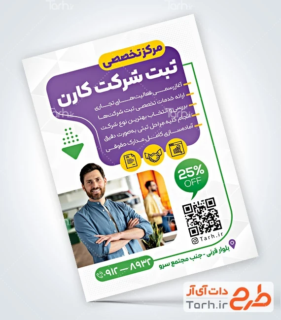 طرح تراکت آماده ثبت شرکت با محل جایگذاری عکس با فرمت psd و قابل ویرایش در نرمافزار فتوشاپ بهصورت لایه باز توسط تیم طراحان طرح دات آی آر طراحی شده است. در نمونه تراکت ثبت شرکت از تصاویر و المانهای باکیفیت و متناسب با استاندارد چاپ استفادهشده، همچنین نکات مهم در طرح تراکت ثبت شرکت مانند رنگبندی، رعایت حاشیه، فاصلهها، فضای کافی برای درج متن، سایز و نوع فونت مناسب طراحی تراکت و ... رعایت گردیده است. طرح لایه باز تراکت خدمات ثبت شرکت شامل عکس شرکت میباشد که المانهای استفادهشده در طرح تراکت خدمات ثبت شرکت قابلیت ویرایش، جابهجایی و تغییر سایز را دارا بوده و شما میتوانید متناسب باسلیقه خودتان تراکت لایه باز ثبت شرکت را ویرایش نمایید، همچنین با تغییر تصاویر و متنها میتوانید طرح تراکت خدمات ثبت دفاتر را به طرح تراکت کسب و کار مد نظر خود شخصی سازی نمایید.