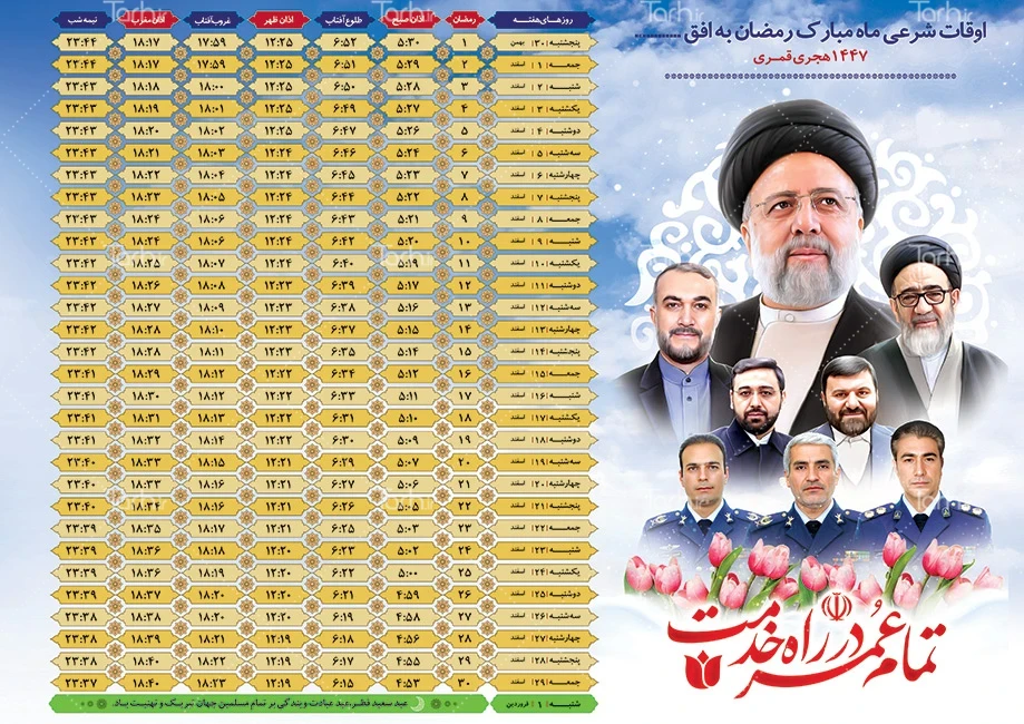 طرح لایه باز تراکت اوقات شرعی ماه رمضان 1404 با عکس شهدای خدمت کد فایل 0834792