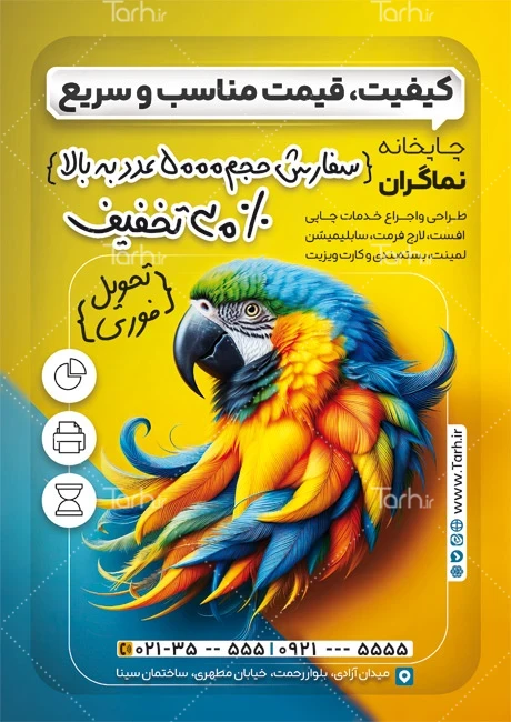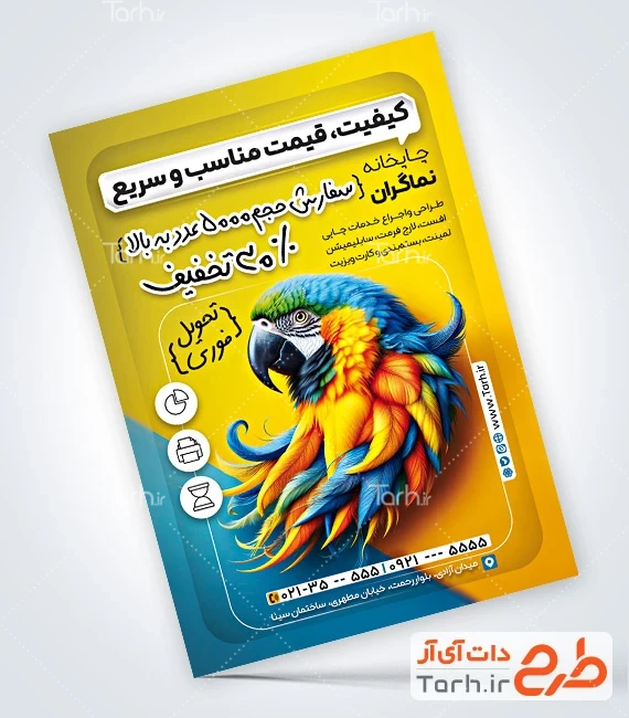 پوستر تبلیغاتی چاپخانه با فرمت psd و قابل ویرایش در نرمافزار فتوشاپ بهصورت لایه باز توسط تیم طراحان طرح دات آی آر طراحی شده است. در نمونه تراکت چاپ خانه از تصاویر و المانهای باکیفیت و متناسب با استاندارد چاپ استفادهشده، همچنین نکات مهم در طرح تراکت چاپخانه مانند رنگبندی، رعایت حاشیه، فاصلهها، فضای کافی برای درج متن، سایز و نوع فونت مناسب طراحی تراکت و ... رعایت گردیده است. طرح لایه باز تراکت چاپخانه شامل عکس طوطی میباشد که المانهای استفادهشده در طرح تراکت چاپ و تبلیغات قابلیت ویرایش، جابهجایی و تغییر سایز را دارا بوده و شما میتوانید متناسب باسلیقه خودتان تراکت لایه باز چاپخانه را ویرایش نمایید، همچنین با تغییر تصاویر و متنها میتوانید طرح تراکت چاپ دیجیتال را به طرح تراکت کسب و کار مد نظر خود شخصی سازی نمایید.
