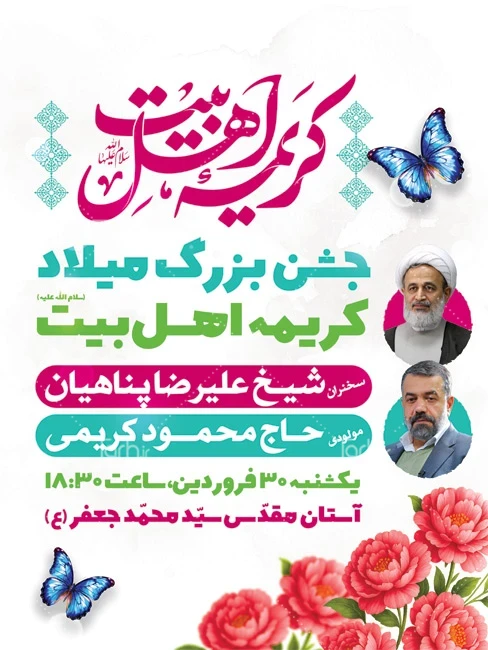 طرح پوستر اطلاعیه مراسم جشن ولادت حضرت معصومه با خوشنویسی کریمه اهل بیت کد فایل 0863941