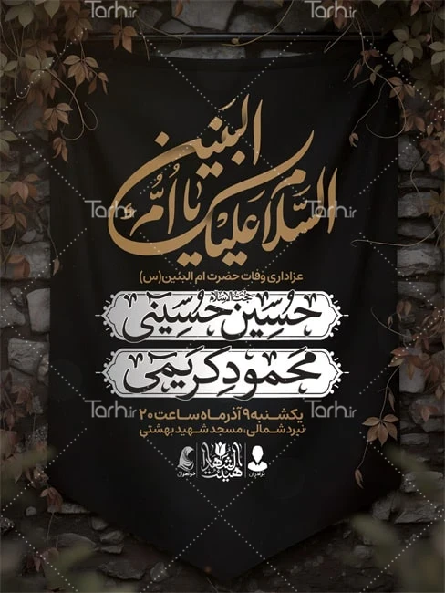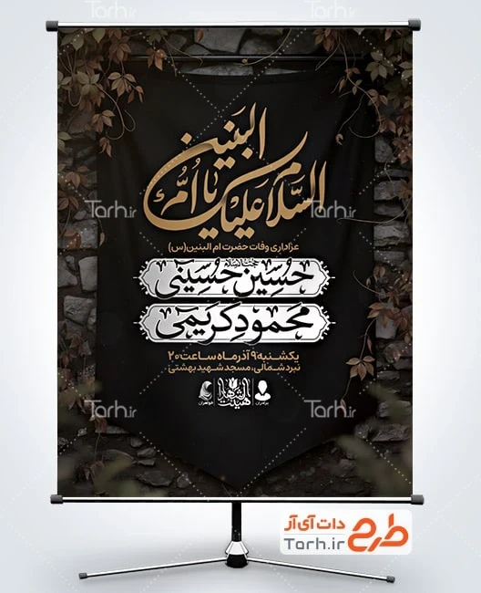 طرح لایه باز پوستر اطلاعیه وفات حضرت ام البنین با تایپوگرافی السلام علیک یا ام البنین کد فایل 0915328
