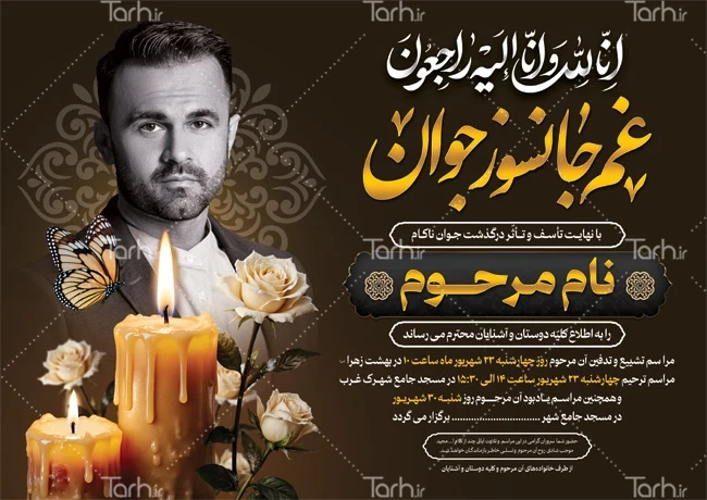 طرح لایه باز اعلامیه ترحیم جوان ناکام با فرمت psd و قابل ویرایش در نرمافزار فتوشاپ بهصورت لایه باز توسط تیم طراحان طرح دات آی آر طراحی شده است. در فایل لایه باز اعلامیه ترحیم جوان از تصاویر و المانهای باکیفیت و متناسب با استاندارد چاپ استفادهشده، همچنین نکات مهم در طرح آگهی ترحیم جوان مانند رنگبندی، رعایت حاشیه، فاصلهها، فضای کافی برای درج متن، سایز و نوع فونت مناسب طراحی آگهی ترحیم و ... رعایت گردیده است. طرح لایه باز آگهی ترحیم قابل ویرایش پسر جوان شامل خوشنویسی انا لله و انا الیه راجعون، محل جایگذاری عکس متوفی، وکتور گل و شمع میباشد که المانهای استفادهشده در آگهی ترحیم لایه باز جوان قابلیت ویرایش، جابهجایی و تغییر سایز را دارا بوده و شما میتوانید متناسب باسلیقه خودتان نمونه اعلامیه ترحیم جوان را ویرایش نمایید.