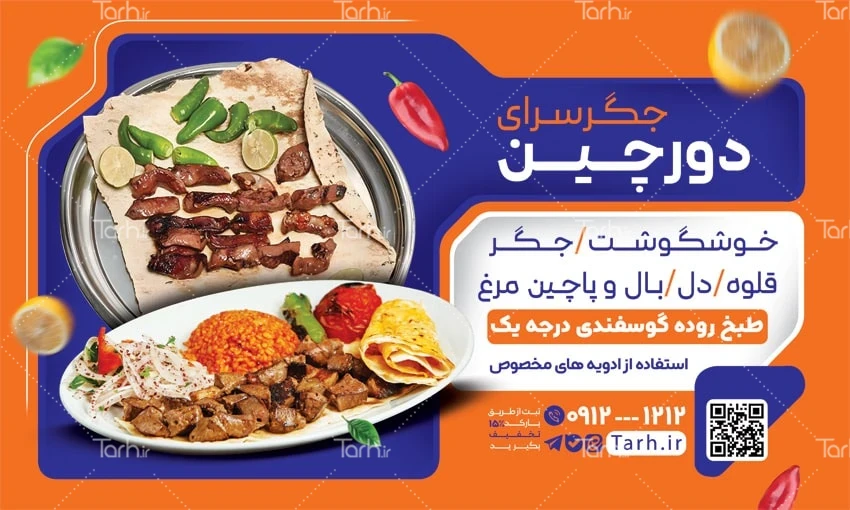 بنر لایه باز جیگرکی با فرمت psd و قابل ویرایش در نرمافزار فتوشاپ بهصورت لایه باز توسط تیم طراحان طرح دات آی آر طراحی شده است. در طرح لایه باز بنر جگرکی از تصاویر و المانهای باکیفیت و متناسب با استاندارد چاپ استفادهشده، همچنین نکات مهم در طرح بنر مشاغل مانند رنگبندی، رعایت حاشیه، فاصلهها، سایز و نوع فونت مناسب طراحی بنر مشاغل و ... رعایت گردیده است. طرح بنر جگرکی شامل عکس ظرف جگر و دورچین میباشد که المانهای استفادهشده در طرح پوستر جگر سرا قابلیت ویرایش، جابهجایی و تغییر سایز را دارا بوده و شما میتوانید متناسب باسلیقه خودتان طرح بنر تبلیغاتی جگرکی را ویرایش نمایید، همچنین با تغییر تصاویر و متنها میتوانید طرح پوستر جگر فروشی را به طرح پوستر شغل موردنظر خود تبدیل نمایید.