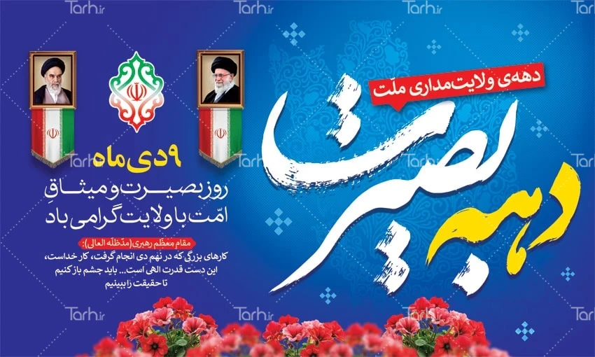 دانلود طرح بنر روز بصیرت و میثاق امت با ولایت با فرمت psd و قابل ویرایش در نرم افزار فتوشاپ به صورت لایه باز توسط تیم طراحان طرح دات آی آر طراحی شده است. در طرح لایه باز حماسه 9 دی روز بصیرت از تصاویر و المان های با کیفیت و متناسب با استاندارد چاپ استفاده گردیده است. دانلود بنر روز بصیرت شامل خوشنویسی دهه بصیرت، وکتور پرچم ایران، قاب عکس امام خمینی و رهبر و وکتور گل میباشد که المان های استفاده شده در بنر لایه باز دهه بصیرت قابلیت ویرایش، جابه جایی و تغییر سایز را دارا بوده و شما می توانید متناسب با سلیقه خودتان طرح بنر 9 دی روز بصیرت را ویرایش نمایید.