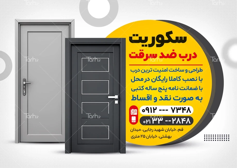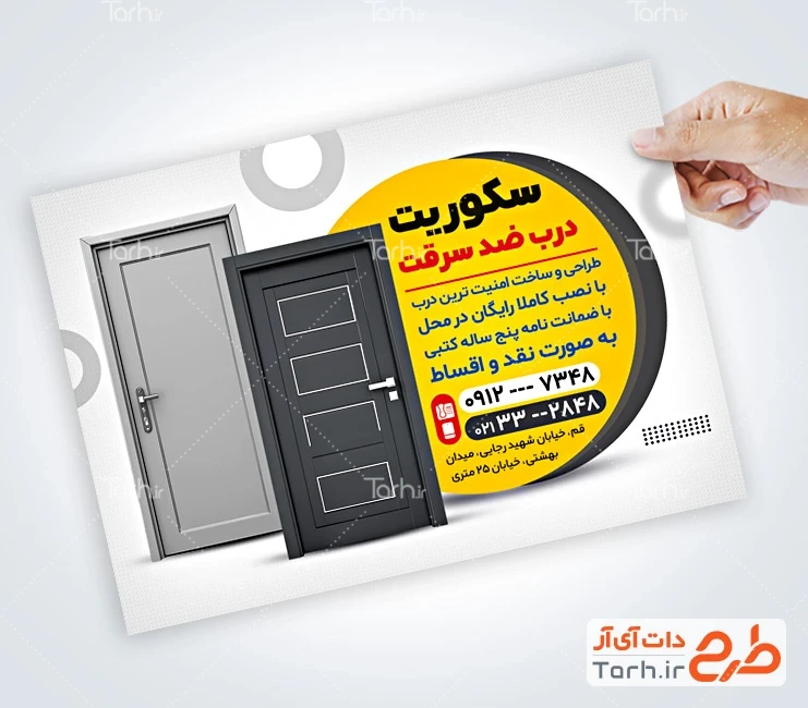 طرح تراکت تبلیغاتی در ضد سرقت با فرمت psd و قابل ویرایش در نرمافزار فتوشاپ بهصورت لایه باز توسط تیم طراحان طرح دات آی آر طراحی شده است. در نمونه تراکت دربهای ضد سرقت از تصاویر و المانهای باکیفیت و متناسب با استاندارد چاپ استفادهشده، همچنین نکات مهم در طرح تراکت درب ضد سرقت لایه باز مانند رنگبندی، رعایت حاشیه، فاصلهها، فضای کافی برای درج متن، سایز و نوع فونت مناسب طراحی تراکت و ... رعایت گردیده است. طرح لایه باز تراکت درب ضد سرقت شامل عکس در ضد سرقت و متن تبلیغاتی فروش و نصب درب ضد سرقت میباشد که المانهای استفادهشده در طرح خام تراکت درب ضد سرقت قابلیت ویرایش، جابهجایی و تغییر سایز را دارا بوده و شما میتوانید متناسب باسلیقه خودتان تراکت لایه باز درب های ضد سرقت را ویرایش نمایید، همچنین با تغییر تصاویر و متنها میتوانید طرح تراکت درب ضدسرقت را به طرح تراکت کسب و کار مد نظر خود شخصی سازی نمایید.