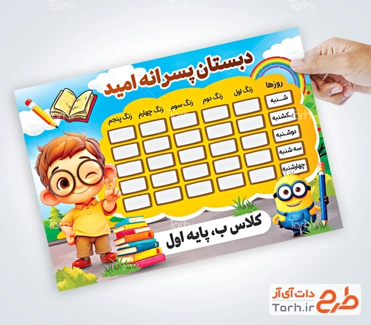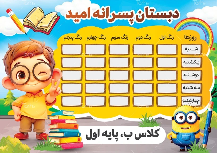 فایل لایه باز برنامه هفتگی مدرسه با فرمت psd و قابل ویرایش در نرم افزار فتوشاپ به صورت لایه باز توسط تیم طراحان طرح دات آی آر طراحی شده است. در طرح برنامه هفتگی مدرسه از تصاویر و المانهای با کیفیت و متناسب با استاندارد چاپ استفاده شده است. طرح لایه باز برنامه کلاسی برای برنامه ریزی درسی هفتگی در مدارس، مراکز آموزشی و همچنین استفاده شخصی دانش آموزان کاربرد دارد. طرح آماده برنامه کلاسی مدرسه از جلمه برنامه هفتگی مدرسه ابتدایی شامل تصویرسازی دانش آموز و مینیون میباشد. المانهای استفاده شده در طرح برنامه کلاسی مدارس قابلیت ویرایش، جابه جایی و تغییر سایز را دارا بوده و شما می توانید متناسب با سلیقه خودتان طرح لایه باز برنامه هفتگی را ویرایش نمایید.