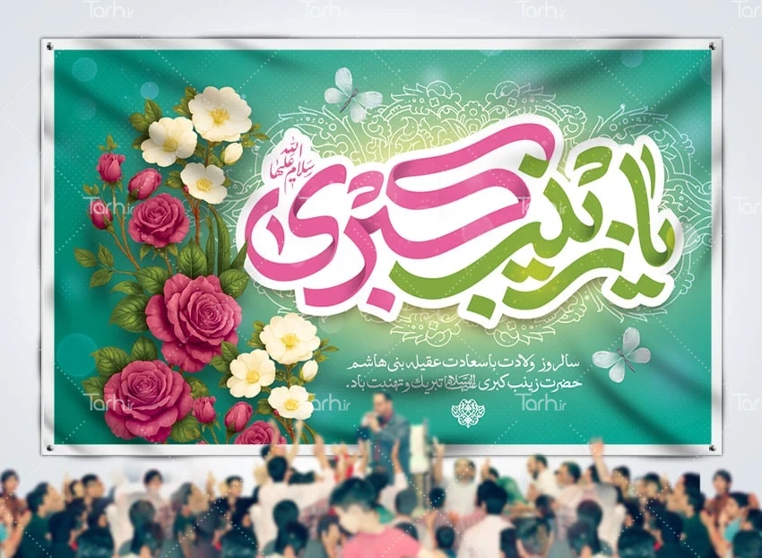 طرح لایه باز بنر پشت سن میلاد حضرت زینب با فرمت psd و قابل ویرایش در نرم افزار فتوشاپ به صورت لایه باز توسط تیم طراحان طرح دات آی آر طراحی شده است. در طرح لایه باز بنر ولادت حضرت زینب از تصاویر و المان های با کیفیت و متناسب با استاندارد چاپ استفاده گردیده است. طرح بنر پشت منبری ولادت حضرت زینب شامل تایپوگرافی یا زینب کبری و وکتور گل می باشد که المان های استفاده شده در طرح بنر پشت مداح ولادت حضرت زینب قابلیت ویرایش، جابه جایی و تغییر سایز را دارا بوده و شما می توانید متناسب با سلیقه خودتان طرح دکور میلاد حضرت زینب لایه باز را ویرایش نمایید.