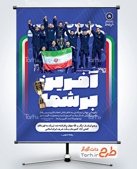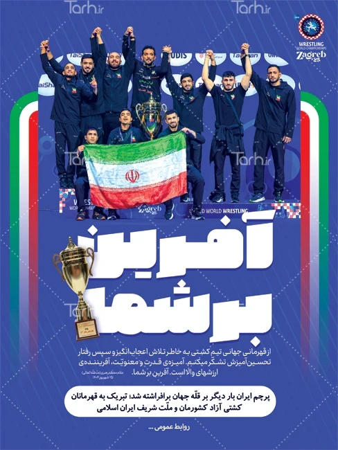 طرح بنر تبریک قهرمانی تیم کشتی آزاد با فرمت psd و قابل ویرایش در نرم افزار فتوشاپ به صورت لایه باز توسط تیم طراحان طرح دات آی آر طراحی شده است. در طرح لایه باز قهرمانی کشتی آزاد جهان از تصاویر و المان های با کیفیت و متناسب با استاندارد چاپ استفاده گردیده است. طرح بنر تبریک قهرمانی کشتی شامل محل عکس تیم ملی کشتی ایران به همراه جام و وکتور پرچم ایران و سخن رهبری می باشد که المان های استفاده شده در بنر لایه باز تبریک کشتی قابلیت ویرایش، جابه جایی و تغییر سایز را دارا بوده و شما می توانید متناسب با سلیقه خودتان بنر لایه باز تبریک قهرمانی تیم کشتی آزاد را ویرایش نمایید.