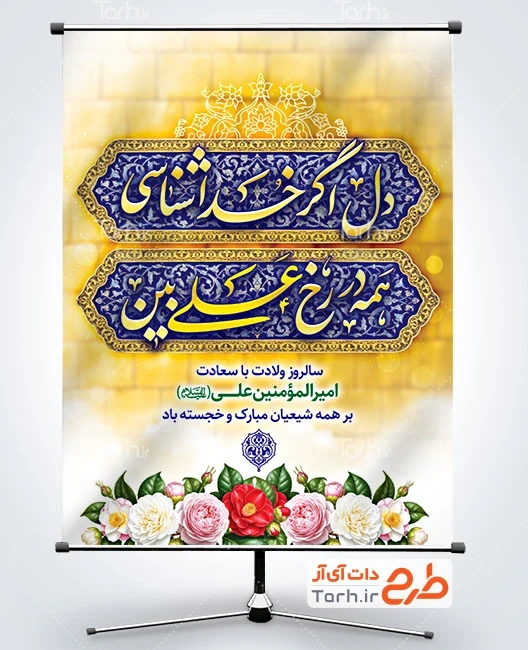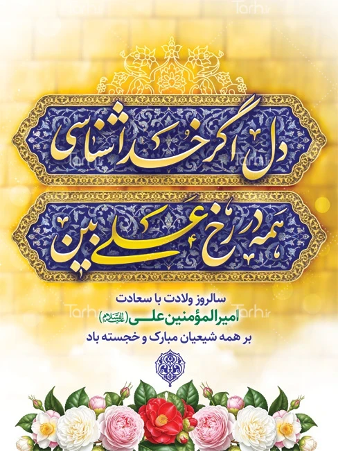 طرح لایه باز پوستر میلاد امام علی دارای خوشنویسی شعر دل اگر خداشناسی کد فایل 1426085