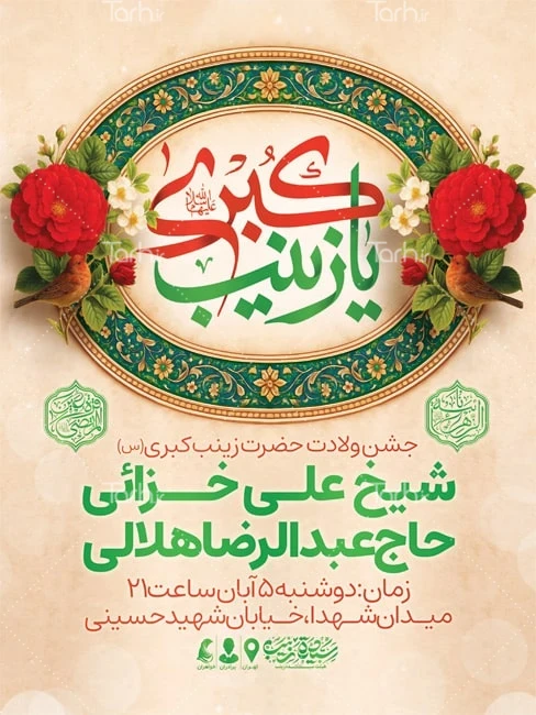 طرح بنر اطلاع رسانی ولادت حضرت زینب با فرمت psd و قابل ویرایش در نرم افزار فتوشاپ به صورت لایه باز توسط تیم طراحان طرح دات آی آر طراحی شده است. در طرح لایه باز اطلاعیه ولادت حضرت زینب از تصاویر و المان های با کیفیت و متناسب با استاندارد چاپ استفاده گردیده است. طرح بنر اطلاع رسانی میلاد حضرت زینب شامل تایپوگرافی یا زینب کبری، وکتور گل و دارای مکان و زمان مراسم جشن میلاد حضرت زینب کبری (س) می باشد که المان های استفاده شده در طرح اطلاعیه خام ولادت حضرت زینب قابلیت ویرایش، جابه جایی و تغییر سایز را دارا بوده و شما می توانید متناسب با سلیقه خودتان طرح اطلاعیه ولادت حضرت زینب را ویرایش نمایید.