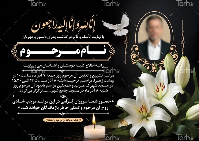 طرح رایگان آگهی ترحیم پدر با فرمت psd و قابل ویرایش در نرمافزار فتوشاپ بهصورت لایه باز توسط تیم طراحان طرح دات آی آر طراحی شده است. در فایل لایه باز اعلامیه ترحیم پدر از تصاویر و المانهای باکیفیت و متناسب با استاندارد چاپ استفادهشده، همچنین نکات مهم در طرح آگهی ترحیم پدر مانند رنگبندی، رعایت حاشیه، فاصلهها، فضای کافی برای درج متن، سایز و نوع فونت مناسب طراحی آگهی ترحیم و ... رعایت گردیده است. طرح آگهی ترحیم پدر شامل جایگاه عکس پدر، خوشنویسی انا لله و انا الیه راجعون میباشد که المانهای استفادهشده در آگهی ترحیم لایه باز پدر قابلیت ویرایش، جابهجایی و تغییر سایز را دارا بوده و شما میتوانید متناسب باسلیقه خودتان نمونه اعلامیه ترحیم پدر را ویرایش نمایید.