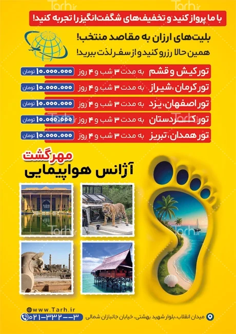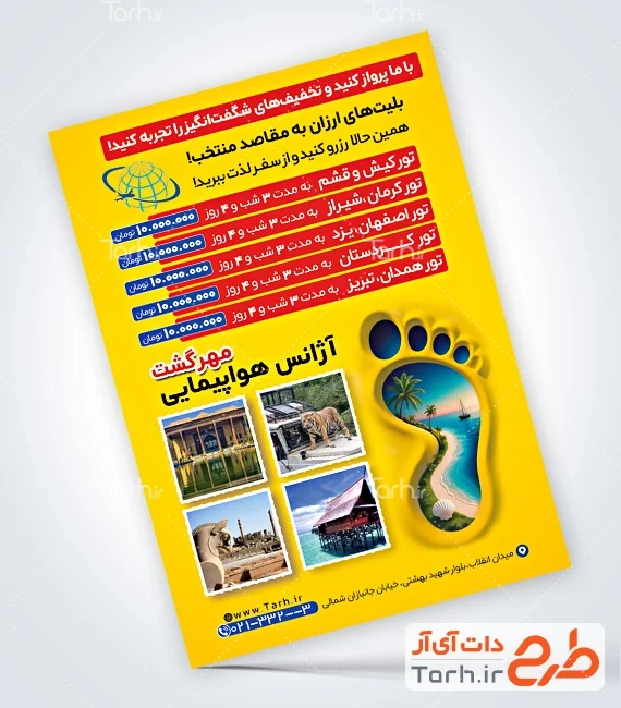 ابعاد طرح تراکت تبلیغاتی تور گردشگری در جدول ویژگیهای فایل درجشده و با توجه به لایه باز بودن و کیفیت بالای طرح آژانس هواپیمایی، قابلیت ویرایش و تبدیل به سایز دلخواه، همچنین چاپ روی متریالهای مختلف مانند بنر، کاغذ، گلاسه و ... را دارا میباشد. برای مثال تراکت خام آژانس گردشگری در ابعاد A4 رزولوشن 300 dpi قابلیت چاپ بنر و لارج فرمت در ابعاد بزرگتر مانند 3 در 4 متر و بدون افت کیفیت را دارا میباشد. تراکت ها به عنوان یک ابزار تبلیغاتی بسیار موثر محسوب می شوند و به دلیل هزینه کم و تأثیر بالا، در بسیاری از کسب و کارها به عنوان روشی برای تبلیغات و رویدادهای مختلف مورد استفاده قرار می گیرند.