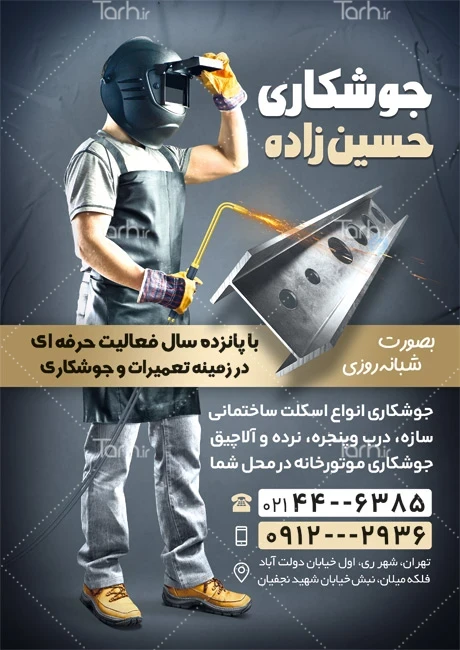 دانلود تراکت خدمات جوشکاری و برشکاری با فرمت psd و قابل ویرایش در نرمافزار فتوشاپ بهصورت لایه باز توسط تیم طراحان طرح دات آی آر طراحی شده است. در نمونه تراکت جوشکاری از تصاویر و المانهای باکیفیت و متناسب با استاندارد چاپ استفادهشده، همچنین نکات مهم در طرح تراکت جوشکاری مانند رنگبندی، رعایت حاشیه، فاصلهها، فضای کافی برای درج متن، سایز و نوع فونت مناسب طراحی تراکت و ... رعایت گردیده است. طرح لایه باز تراکت برشکاری شامل عکس تیرآهن و جوشکار میباشد که المانهای استفادهشده در طرح تراکت جوشکاری و برشکاری قابلیت ویرایش، جابهجایی و تغییر سایز را دارا بوده و شما میتوانید متناسب باسلیقه خودتان تراکت لایه باز برشکاری را ویرایش نمایید، همچنین با تغییر تصاویر و متنها میتوانید طرح تراکت آهنگری و جوشکاری را به طرح تراکت کسب و کار مد نظر خود شخصی سازی نمایید.
