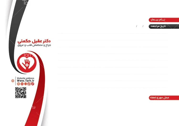 دانلود سرنسخه دکتر قلب با فرمت psd و قابل ویرایش در نرمافزار فتوشاپ بهصورت لایه باز توسط تیم طراحان طرح دات آی آر طراحی شده است. در طرح لایه باز سرنسخه متخصص قلب از المانهای باکیفیت و متناسب با استاندارد چاپ استفادهشده، همچنین نکات مهم در طرح سرنسخه متخصص قلب مانند رنگبندی، رعایت حاشیه، فاصلهها، فضای کافی برای درج متن، سایز و نوع فونت مناسب طراحی سرنسخه و ... رعایت گردیده است. سرنسخه خام متخصص قلب شامل محل جایگذاری اطلاعات بیمار و نام پزشک میباشد که المانهای استفادهشده در طرح سرنسخه قلب و عروق قابلیت ویرایش، جابهجایی و تغییر سایز را دارا بوده و شما میتوانید متناسب باسلیقه خودتان طرح سر نسخه پزشک را ویرایش نمایید، همچنین با تغییر لوگو و متنها میتوانید طرح سرنسخه پزشک قلب و عروق را به طرح سربرگ دکتر مد نظر خود شخصی سازی نمایید. سربرگ نسخه پزشک به عنوان یک قالب یا برگه کاغذی با سربرگ توسط پزشکان و متخصصان پزشکی برای ایجاد نسخههای مختلف، تجویز دارو، اسناد پزشکی و نامههای پزشکی مورد استفاده قرار میگیرد. سربرگ پزشک معمولاً اطلاعات و مشخصات پزشک را دربرمیگیرد و به پزشکان کمک میکند تا ارتباطات خود با بیماران، دیگر پزشکان، و سایر نهادها را به صورت حرفهای و معتبر انجام دهند و اصالت اسناد پزشکی را حفظ کنند.