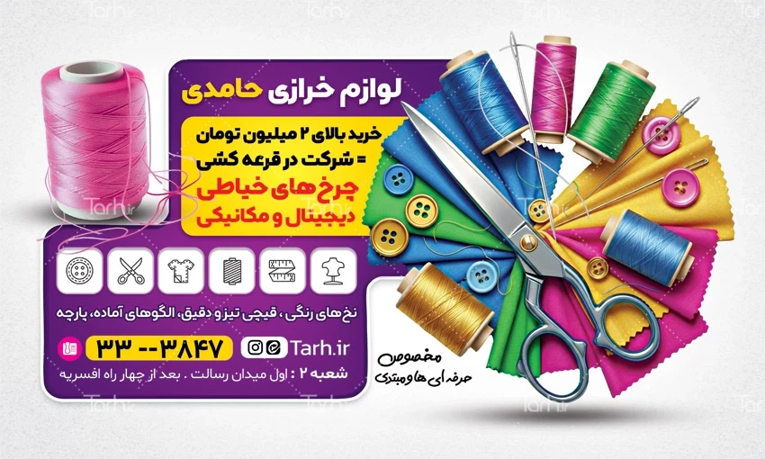 ابعاد طرح بنر لوازم خیاطی در جدول ویژگی های فایل درج شده و با توجه به لایه باز بودن و کیفیت بالای طرح خرازی، قابلیت ویرایش و تبدیل به سایز دلخواه، همچنین چاپ روی متریال های مختلف مانند کاغذ، بنر، فلکس و مش را دارا می باشد. برای مثال بنر خام خرازی و لوازم خیاطی در ابعاد 50 در 30 سانتیمتر رزولوشن 300 dpi قابلیت چاپ بنر و لارج فرمت تا ابعاد 10 در 6 متر را بدون افت کیفیت دارد، همچنین برای ابعاد بزرگتر نیز در صورتی که فاصله بیننده تا بنر بیشتر از 8 متر باشد، افت کیفیت به چشم نمی آید. افت کیفیت به چشم نمی آید. طرح لایه باز بنر مشاغل علاوه بر استفاده به عنوان پوستر در مغازه ها و اماکن تجاری، به منظور زیباسازی دکور و فضای داخلی کسب و کارها و مغازه ها قابل استفاده و نصب می باشد.