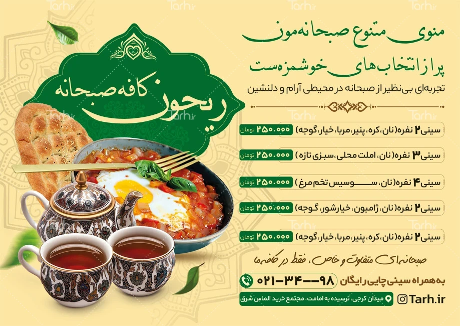 تراکت لایه باز کافه صبحانه با فرمت psd و قابل ویرایش در نرمافزار فتوشاپ بهصورت لایه باز توسط تیم طراحان طرح دات آی آر طراحی شده است. در نمونه تراکت کافه صبحانه از تصاویر و المانهای باکیفیت و متناسب با استاندارد چاپ استفادهشده، همچنین نکات مهم در طرح تراکت کافه صبحانه مانند رنگبندی، رعایت حاشیه، فاصلهها، فضای کافی برای درج متن، سایز و نوع فونت مناسب طراحی تراکت و ... رعایت گردیده است. طرح لایه باز تراکت صبحانه خوری شامل عکس نیمرو و چای میباشد که المانهای استفادهشده در طرح تراکت صبحانه خوری قابلیت ویرایش، جابهجایی و تغییر سایز را دارا بوده و شما میتوانید متناسب باسلیقه خودتان تراکت لایه باز صبحانه سرا و رستوران را ویرایش نمایید، همچنین با تغییر تصاویر و متنها میتوانید طرح تراکت رستوران را به طرح تراکت کسب و کار مد نظر خود شخصی سازی نمایید.