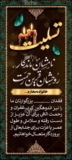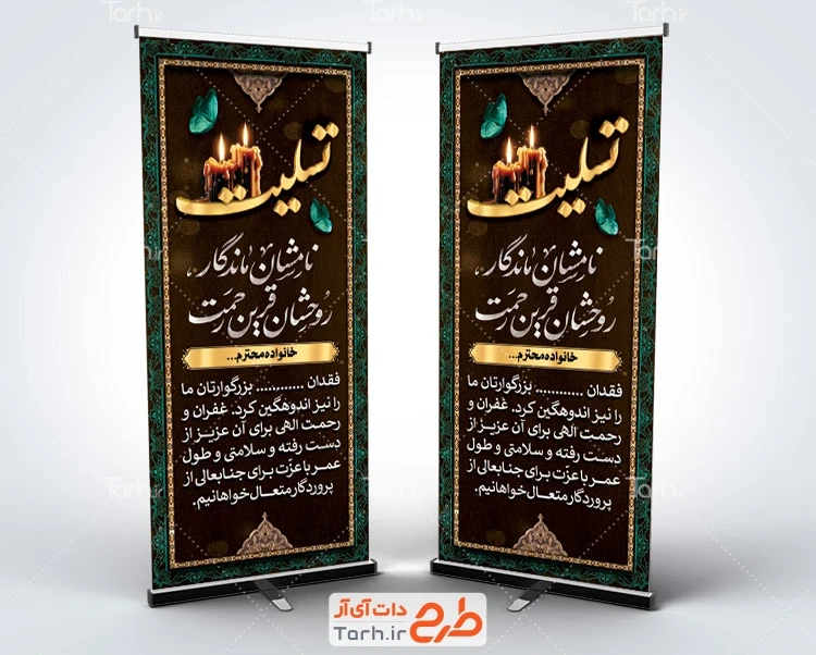 طرح بنر استند تسلیت مرحوم دارای خوشنویسی نامشان ماندگار روحشان قرین رحمت کد فایل 1654930