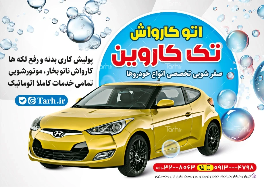 طرح آماده تراکت کارواش اتومبیل با فرمت psd و قابل ویرایش در نرمافزار فتوشاپ بهصورت لایه باز توسط تیم طراحان طرح دات آی آر طراحی شده است. در نمونه تراکت کارواش از تصاویر و المانهای باکیفیت و متناسب با استاندارد چاپ استفادهشده، همچنین نکات مهم در طرح تراکت خام کارواش مانند رنگبندی، رعایت حاشیه، فاصلهها، فضای کافی برای درج متن، سایز و نوع فونت مناسب طراحی تراکت و ... رعایت گردیده است. طرح لایه باز تراکت کارواش شامل عکس ماشین میباشد که المانهای استفادهشده در طرح تراکت کارواش اتومبیل قابلیت ویرایش، جابهجایی و تغییر سایز را دارا بوده و شما میتوانید متناسب باسلیقه خودتان تراکت لایه باز کارواش را ویرایش نمایید، همچنین با تغییر تصاویر و متنها میتوانید طرح تراکت کارواش ماشین را به طرح تراکت کسب و کار مد نظر خود شخصی سازی نمایید.