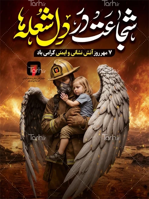 دانلود بنر روز آتش نشانی و ایمنی با فرمت psd و قابل ویرایش در نرم افزار فتوشاپ به صورت لایه باز توسط تیم طراحان طرح دات آی آر طراحی شده است. در بنر خام روز آتش نشانی و ایمنی از تصاویر و المان های با کیفیت و متناسب با استاندارد چاپ استفاده گردیده است. طرح پوستر روز آتش نشانی و ایمنی شامل خوشنویسی شجاعت در درل شعله ها، تصویر آتش نشان با بال فرشته، تصویر کودک، شعله های آتش و آرم آتش نشانی می باشد که المان های استفاده شده در طرح لایه باز پوستر روز آتش نشانی و ایمنی قابلیت ویرایش، جابه جایی و تغییر سایز را دارا بوده و شما می توانید متناسب با سلیقه خودتان طرح گرامیداشت روز آتش نشانی و ایمنی را ویرایش نمایید.