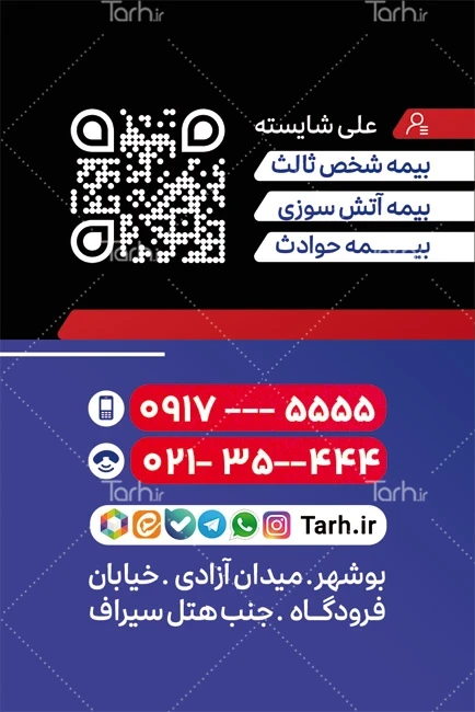 ابعاد طرح لایه باز کارت ویزیت دفتر بیمه در جدول ویژگیهای فایل درجشده و با توجه به لایه باز بودن و کیفیت بالای طرح بیمه دانا، قابلیت ویرایش و تبدیل به سایز دلخواه مانند کارت ویزیت مربع، دایره، برش خاص، قالب اختصاصی و ... را دارا میباشد. کارت ویزیت خام بیمه دانا قابلیت چاپ افست و چاپ دیجیتال روی انواع جنس کارت ویزیت مانند گلاسه، لمینت، کتان، کرافت، سلفون و پیویسی و ... را دارد. همچنین میتوان از طرح های کارت ویزیت جهت چاپ اتیکت، لیبل، کارت آویز و ... نیز استفاده کرد.